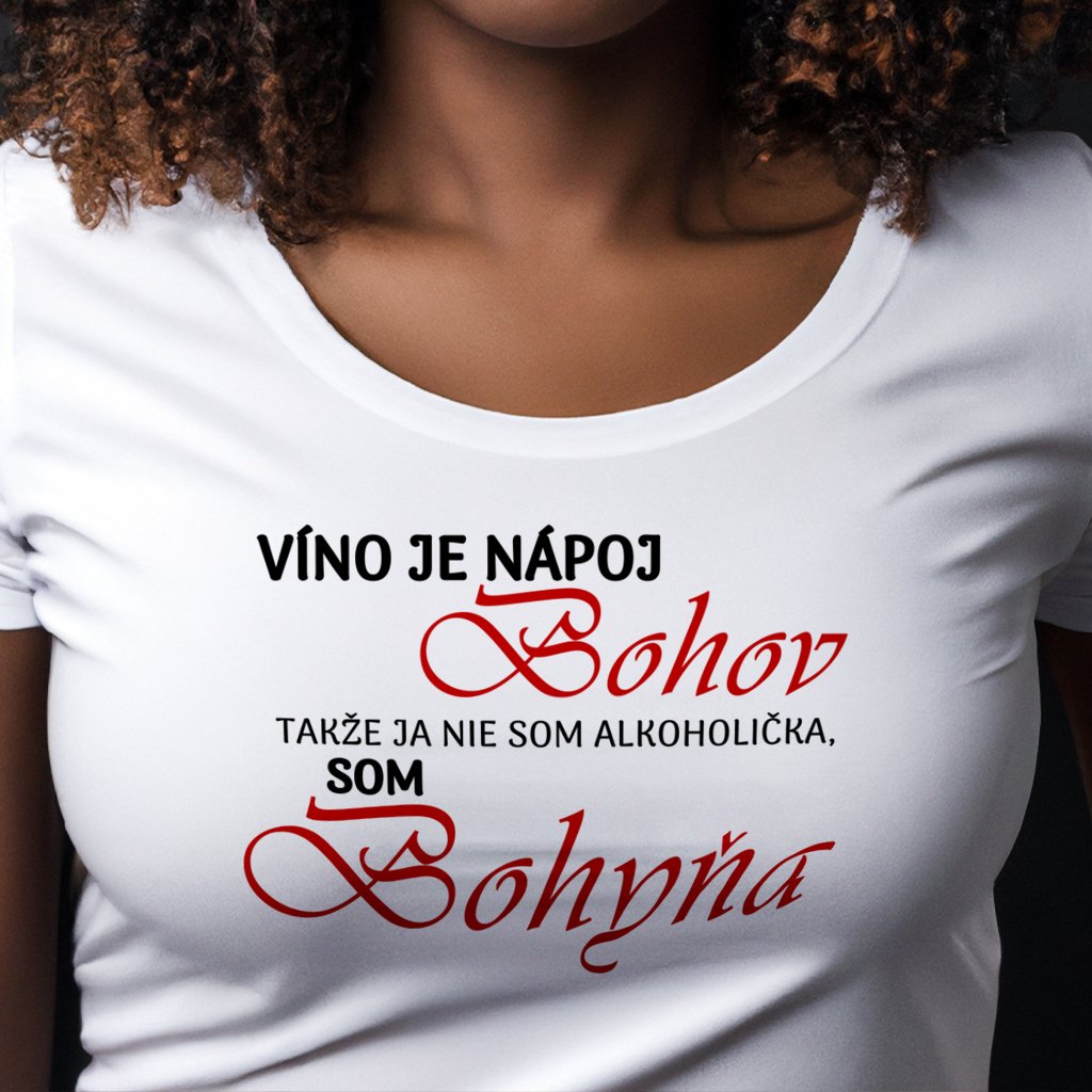 dámske biele tričko s krátkym rukávom - víno je nápoj Bohov a ja som Bohyňa