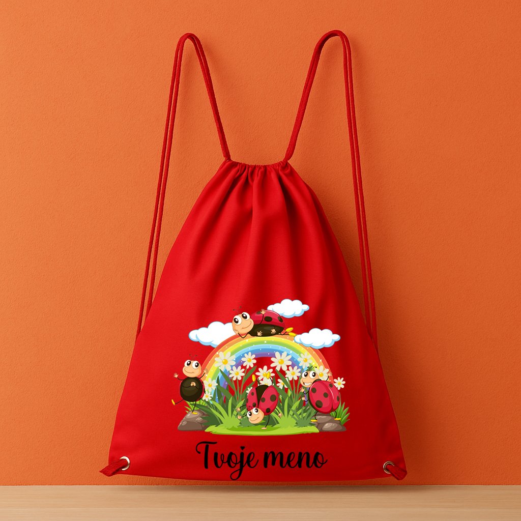 Štýlový a praktický vak pre malé lienky! Tento bavlnený batoh s výraznou potlačou lienok a dúhy a s vlastným menom, ktoré stačí uviesť do poznámky k objednávke je ideálny na každodenné nosenie – či už do školy, na telesnú výchovu, krúžky alebo výlety.