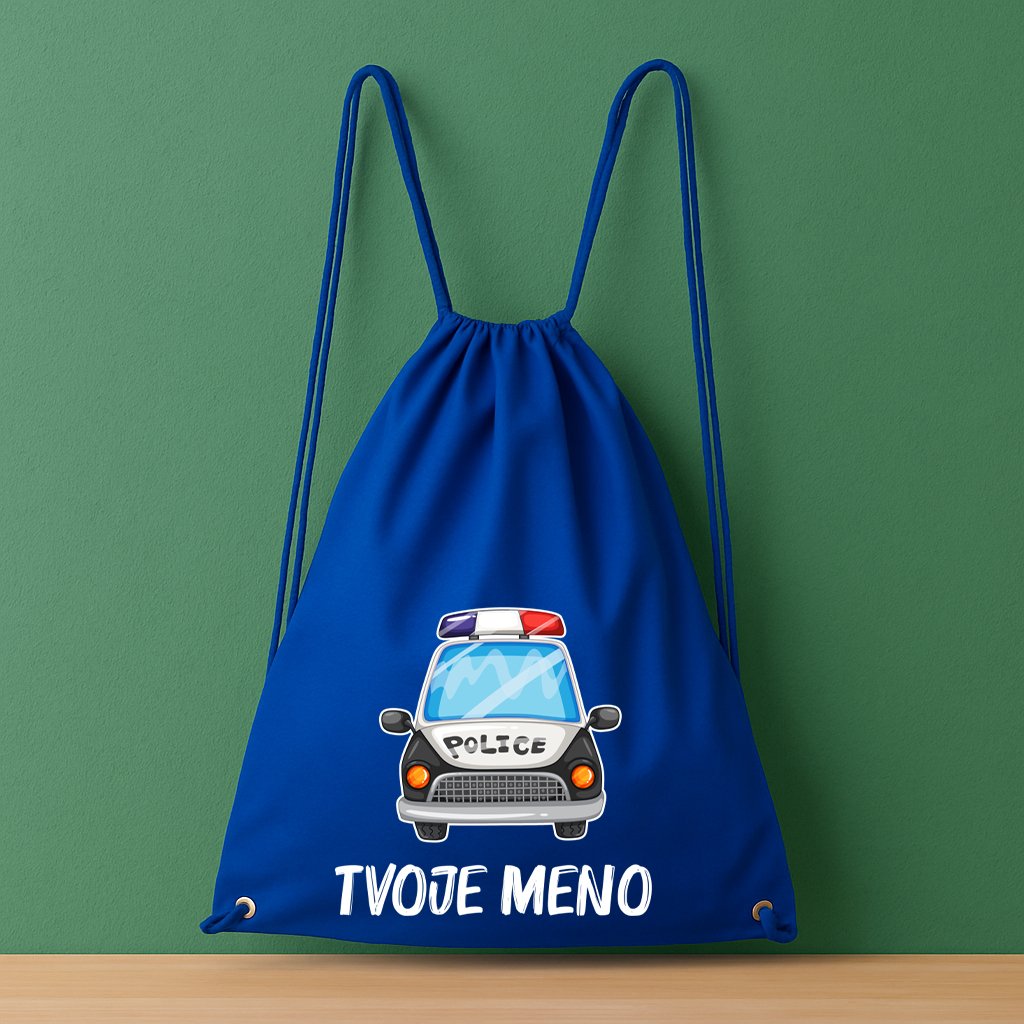 Štýlový a praktický vak pre malých policajtov! Tento bavlnený batoh s výraznou potlačou policajného auta a s vlastným menom, ktoré stasčí uviesť do poznámky k objednávke je ideálny na každodenné nosenie – či už do školy, na telesnú výchovu, krúžky alebo výlety.