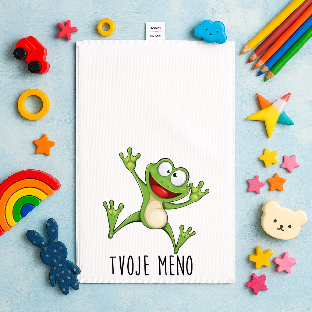 Originálny detský uteráčik z jemného mikrovlákna s veselým motívom so žabkou, ktorý si môžete personalizovať vlastným menom! Ideálny do škôlky, školy, na krúžky alebo len tak na doma.