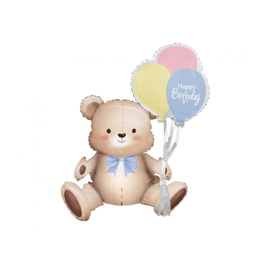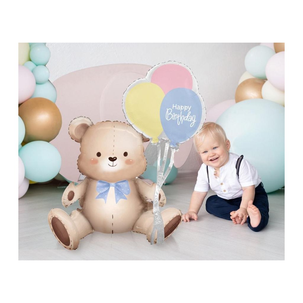 Fóliový balónik v tvare roztomilého medvedíka s balónikmi a nápisom „Happy Birthday“ je skvelou ozdobou na oslavu narodenín, balónikovú dekoráciu alebo na oslavu prvých narodenín. Balónik je určený na nafukovanie kombináciou vzduchu a hélia, má rozmery 41 x 76 x 31 cm a je vyrobený z veľmi pevnej fólie.