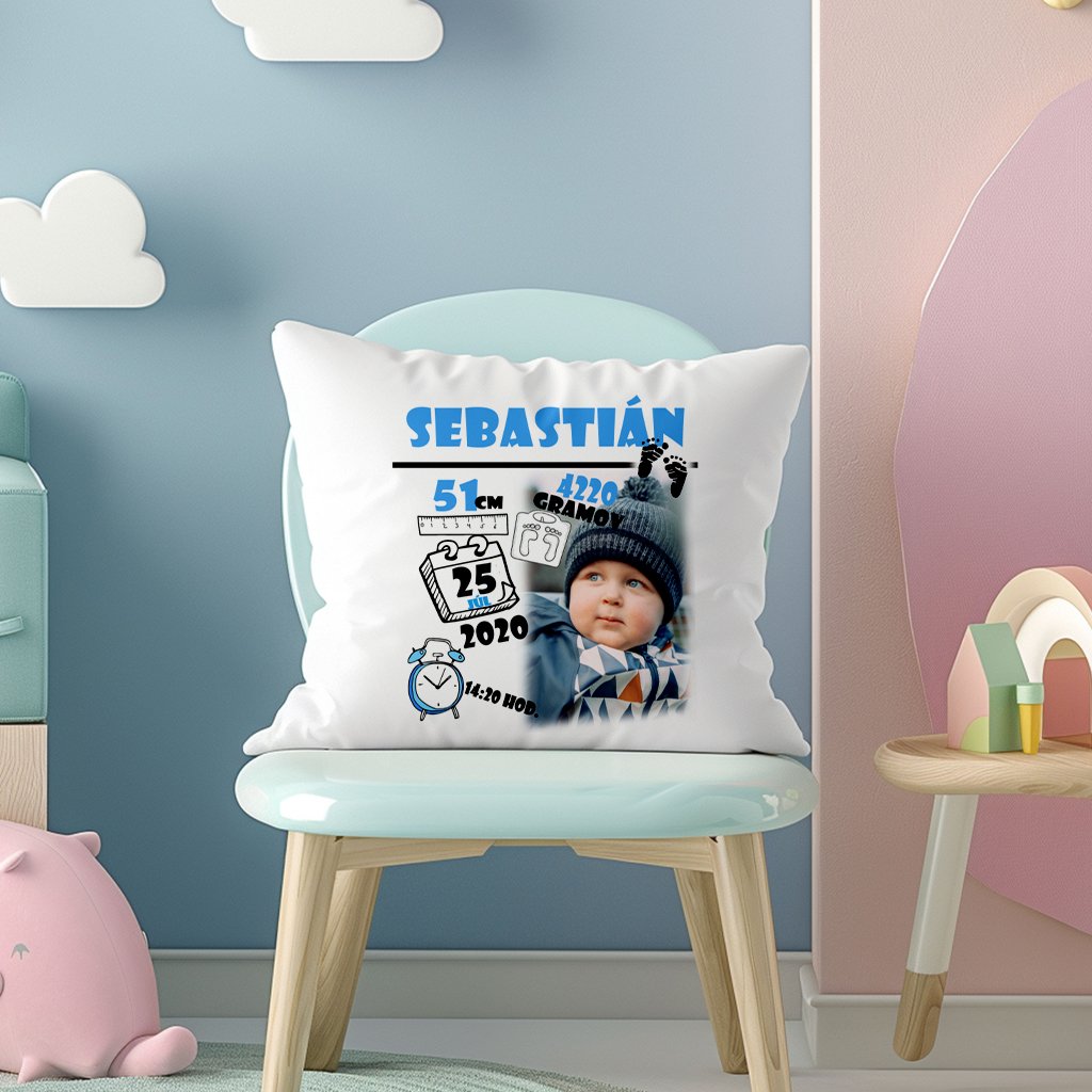 Vankúš pre chlapčeka s údajmi o narodení a vlastnou fotografiou